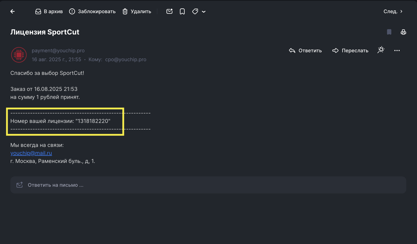 - После оплаты лицензии вместе с чеком на указанный адрес электронный почты придет лицензионный ключ. Его необходимо скопировать из письма.