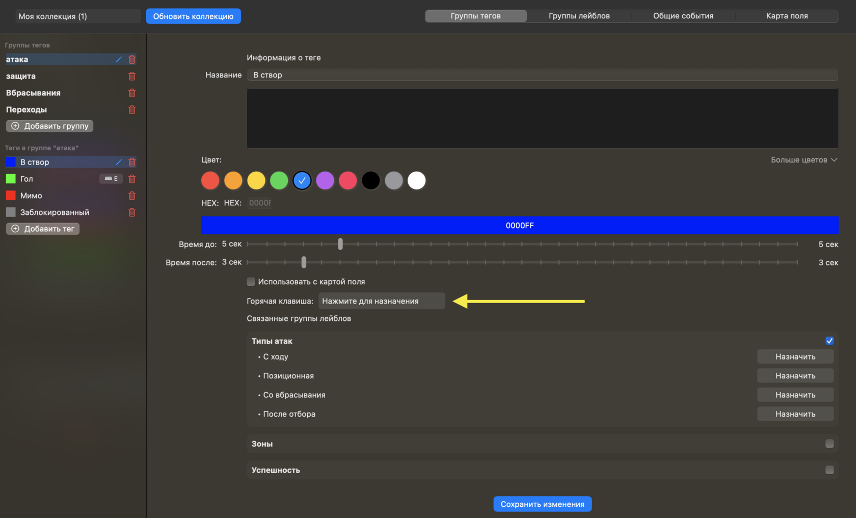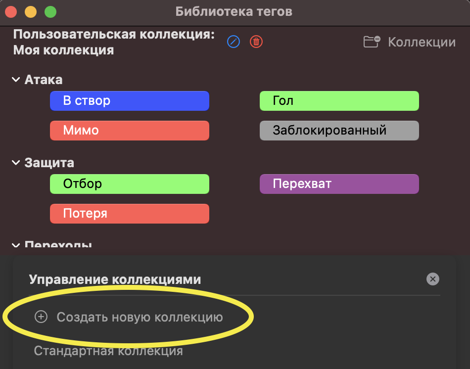 Коллекция тегов представляет собой набор игровых действий, на основе которых пользователь размечает видео. Такими действиями могут быть как технико-тактические метрики (потери, отборы, броски), так и элементы командного взаимодействия (построения, раскаты, фазы перехода из обороны в атаку). Коллекцию можно создать один раз, и она автоматически сохраняется на все время пользования программой. Не нужно создавать новую для разметки нового видео.